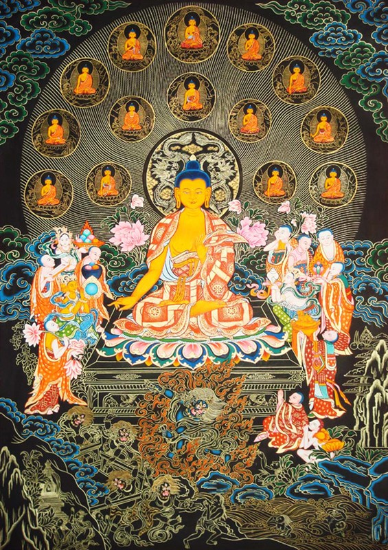 本师释迦牟尼佛五百大愿。故示现娑婆世界成佛。佛子!诸佛如来为令众生生欣乐故,出现于世;欲令众生生恋慕故,示现涅槃;而实如来无有出世,亦无涅槃。何以故?如来常住清净法界,随众生心示现涅槃。佛子!譬如日出,普照世间,于一切净水器中影无不现,普遍众处而无来往,或一器破便不现影。佛子!于汝意云何,彼影不现为日咎不?”答言:“不也。但由器坏,非日有咎。”“佛子!如来智日亦复如是,普现法界无前无后,一切众生净心器中佛无不现,心器常净常见佛身,若心浊器破则不得见。佛子!若有众生应以涅槃而得度者,如来则为示现涅槃,而实如来无生、无殁、无有灭度。佛子!譬如火大,于一切世间能为火事,或时一处其火息灭。于意云何,岂一切世间火皆灭耶?”答言:“不也。”“佛子!如来、应、正等觉亦复如是,于一切世界施作佛事,或于一世界能事已毕示入涅槃,岂一切世界诸佛如来悉皆灭度?佛子!菩萨摩诃萨应如是知如来、应、正等觉大般涅槃。