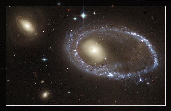 AM 0644-741有一个美丽的蓝色亮光环,人们称它是戒指星系。它的直径有15万光年,比我们的银河系要大很多,距离我们约300光年。(诸庄严具形)