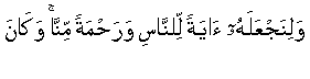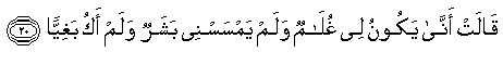 Maryam berkata, "Bagaimana akan ada bagiku seorang anak laki laki, sedang tidak pernah seorang manusiapun menyentuhku dan aku bukan (pula) seorang pezinah!" Jibril berkata: "hal itu adalah mudah bagiku; dan agar dapat Kami menjadikannya suatu tanda bagi manusia dan sebagai rahmat dari Kami; dan hal ini itu adalah suatu perkara yang sudah diputuskan."