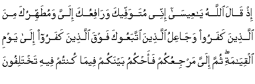 (Ingatlah!) tatkala Allah berfirman: "Hai Isa, sesungguhnya Aku akan mewafatkanmu, dan mengangkatmu kepada-Ku, dan akan mensucikan engkau dari orang orang kafir, dan menjadikan orang orang yang mengikutimu diatas mereka yang kafir hingga hari kiamat."